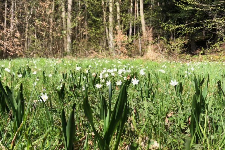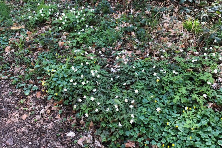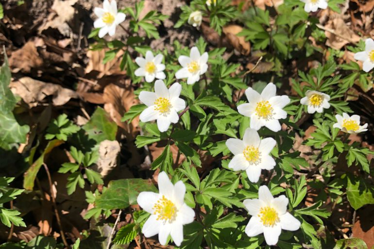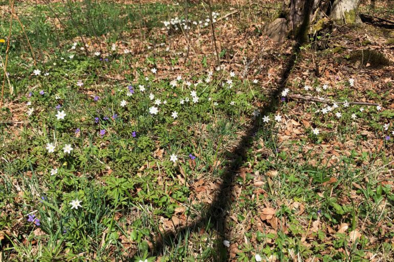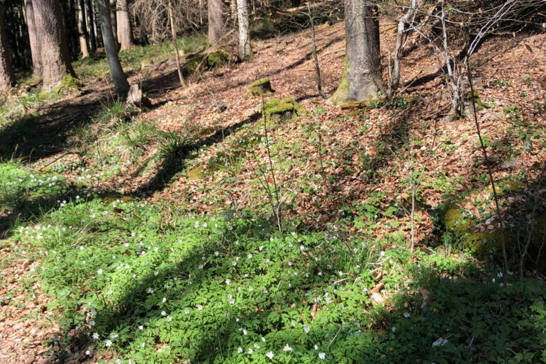 Die Anemone nemorosa findet unter den noch unbelaubten Bäumen im Wald und auf der Wiese genügend Sonnenlicht. Sie sind nun der klare Bote, dass es Frühling wird. Die Wiese erneuert sich. Sie schimmert in einem frischen Grün. Auch die Blätter der Herbstzeitlosen arbeiten sich aus dem Erdreich hervor. Als farblichen Kontrast zeigt sich am Wiesenrand…